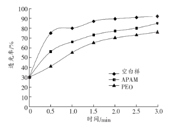 PEO和APAM是造紙中常用的分散劑。實(shí)驗(yàn)選用經(jīng)過(guò)打漿處理的硅酸鋁纖維漿料作為實(shí)驗(yàn)漿料,在漿料中加入分散劑的質(zhì)量分?jǐn)?shù)分別為0、0.5、1.0、1.5、2.0和2.5%(相對(duì)于硅酸鋁纖維用量)。通過(guò)實(shí)驗(yàn)表征硅酸鋁纖維的分散性能及透光率。結(jié)果分別見圖4和圖5。