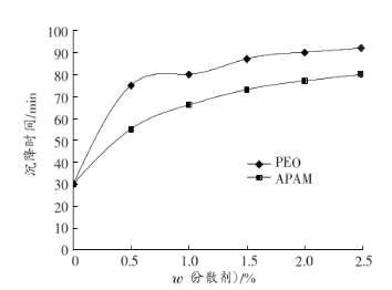 再次,將洗滌后的纖維按不同的加入量,測(cè)定其沉降時(shí)間;并添加不同種類的分散劑,測(cè)定纖維的沉降時(shí)間和透光率。