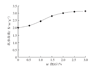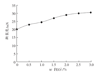 硅酸鋁纖維在不加入膠黏劑的情況下不能成紙,因此加入w(cmc)=10%作為膠黏劑,然后改變PEO的加入量,檢測(cè)PEO的加入量對(duì)成紙強(qiáng)度的影響。結(jié)果見圖6和圖7。