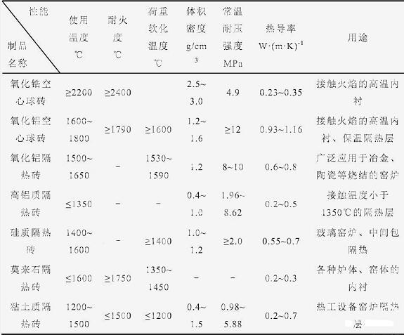 表1是一些常見的高溫隔熱磚性能及用途。由表可知,不同材質(zhì)的保溫隔熱耐火材料有不同的使用溫度及性能特點(diǎn),并最終決定其用途。氧化鋁空心球磚具有良好的保溫性能的同時,還具有使用溫度高、荷重軟化點(diǎn)高、耐壓強(qiáng)度高等特點(diǎn),不但可以做隔熱層,還可以與火焰直接接觸。氧化鋯空心球磚雖比氧化鋁空心球磚具有更好的隔熱性能和更高的使用溫度,但是氧化鋯空心球制品價格高昂、原料儲量有限,一般只用于一些特殊要求的窯爐;而氧化鋁空心球制品則由于氧化鋁原料豐富,性價比高,是當(dāng)前最受歡迎的高溫、高強(qiáng)輕質(zhì)隔熱材料。氧化鋁隔熱磚使用溫度雖然比空心球制品低,但其體積密度比空心球制品低很多,因此熱導(dǎo)率更小,保溫隔熱性能也更好。氧化鋁隔熱磚廣泛應(yīng)用于冶金、陶瓷等燒結(jié)窯爐的保溫,不能承受荷重,要避免直接暴露在具有強(qiáng)烈沖刷、磨損和侵蝕的環(huán)境中。根據(jù)氧化鋁的含量的差異鋁硅系的輕質(zhì)隔熱材料主要分為高鋁隔熱磚、莫來石隔熱磚、黏土質(zhì)隔熱磚和硅質(zhì)隔熱磚,由于這類制品具有較好的隔熱性能,使用溫度又可在較大范圍內(nèi)調(diào)整,適用各種工業(yè)窯爐在一般使用條件(不含金屬溶液或熔渣接觸,無劇烈熱震蕩,無化學(xué)反應(yīng),不受侵蝕,不受劇烈的機(jī)械沖撞、磨損等)下的保溫隔熱,可直接接觸火焰,更多的作為中間保溫隔熱層使用,例如黑色冶金行業(yè)的帶式燒結(jié)機(jī)、球團(tuán)焙燒爐、煉鋼與軋鋼加熱爐的保溫隔熱,有色金屬冶煉的鋁電解槽、鋁熔煉爐、煉鋅電熱蒸餾爐及精餾設(shè)備的保溫隔熱,建材行業(yè)(陶瓷、玻璃、水泥)和石化與化工行業(yè)的催化裂化裝置、合成氨裝置的一段、變換爐、二段轉(zhuǎn)化爐的保溫,以及余熱鍋爐、垃圾焚燒爐、炭素焙燒窯和各種用途的電阻爐等的保溫隔熱,鋁硅系保溫隔熱材料是目前熱工窯爐應(yīng)用最多的保溫隔熱材料。